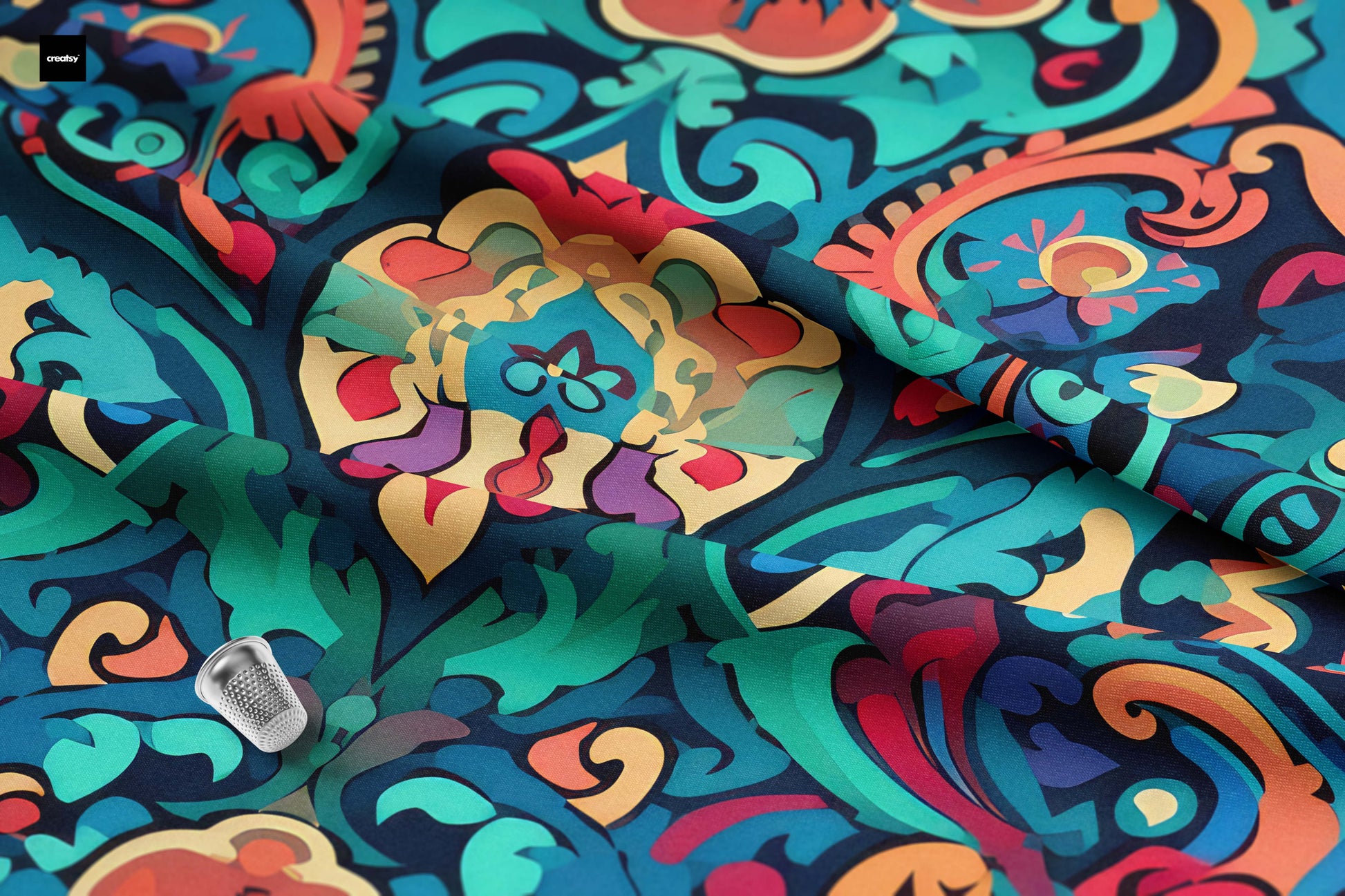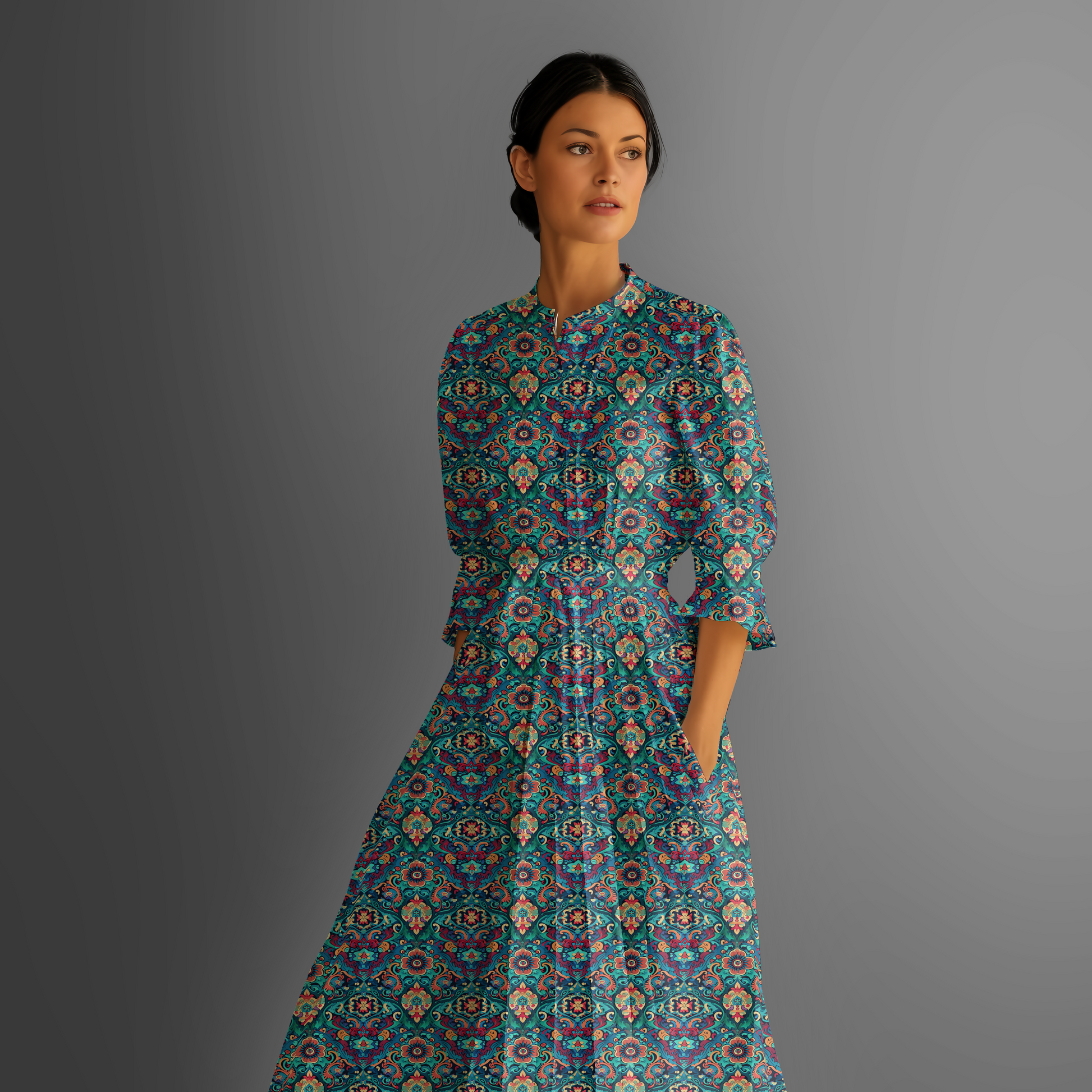 An exclusive Yazhani signature inspired by traditional Arabic artistry, with bold motifs in emerald, deep blue, and crimson — rich, powerful, and mesmerizing.