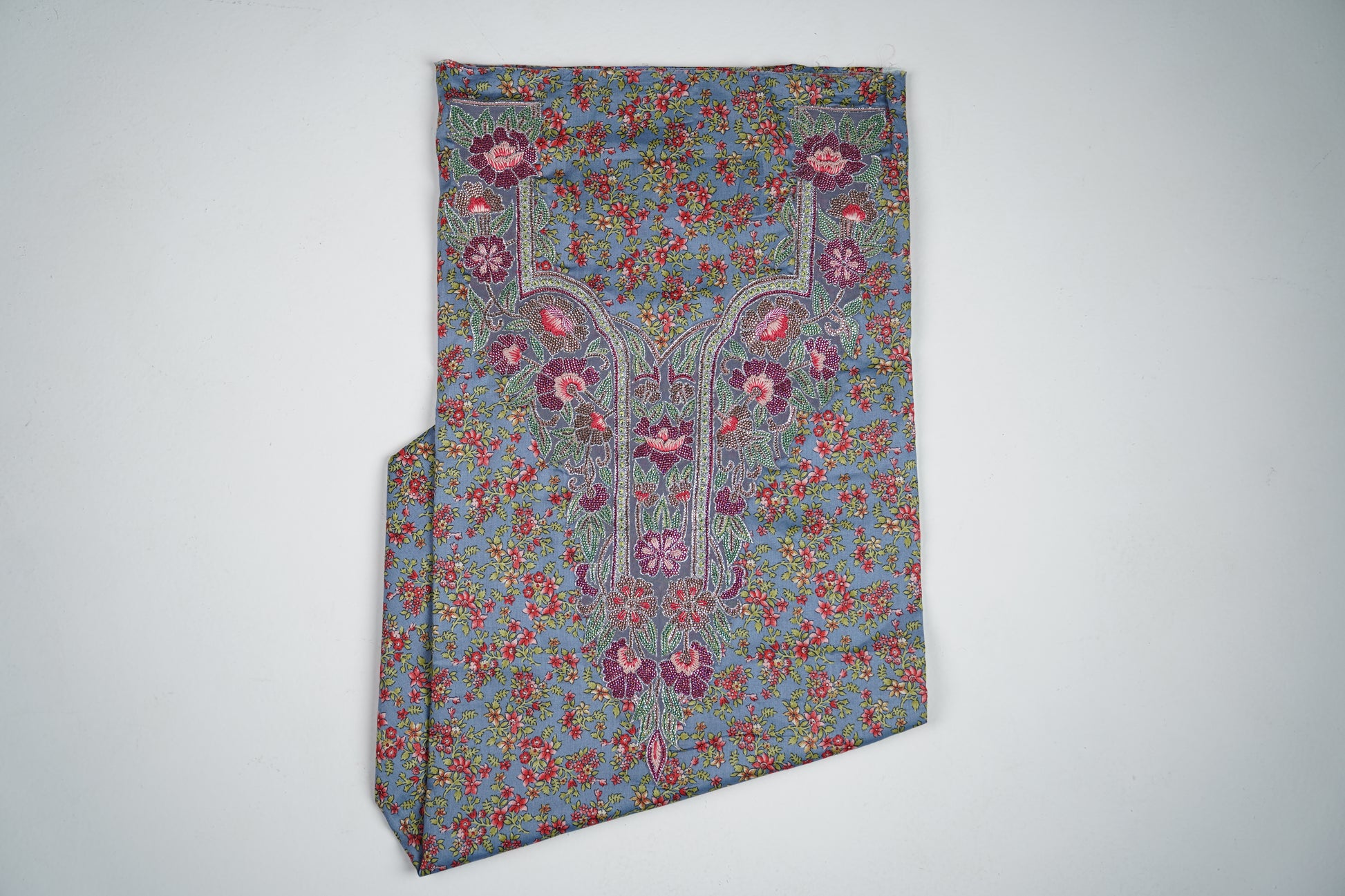 Refined embroidery in deep pink and emerald green silk threads flows gracefully across the neckline in a rich floral composition.
