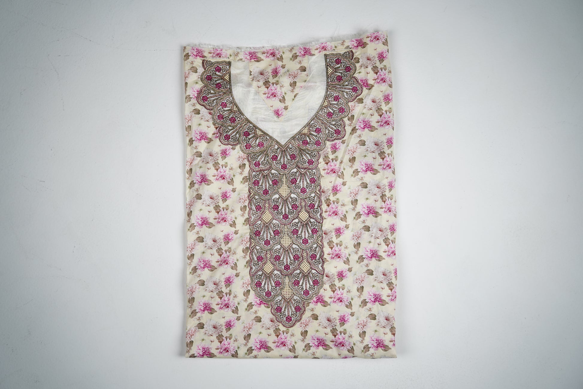 Elegant embroidery in gold and fuchsia threads adorns a deep-cut neckline, inspired by vintage oriental fan motifs, with meticulously arranged beads and crystals.The blend of radiant gold and vivid fuchsia creates a luxurious harmony of warmth and sophistication, capturing a timeless feminine grace in every stitch.
