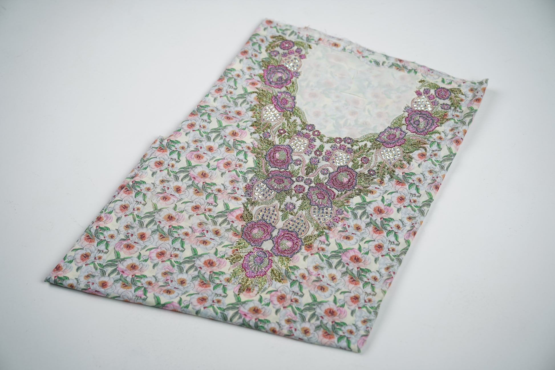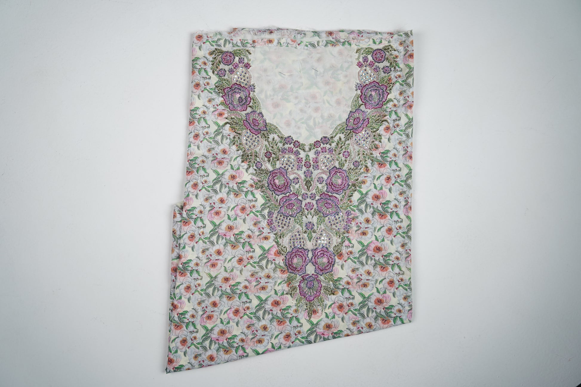 Luxurious embroidery crafted with soft pink, muted gold, and olive green threads elegantly cascades along the neckline.