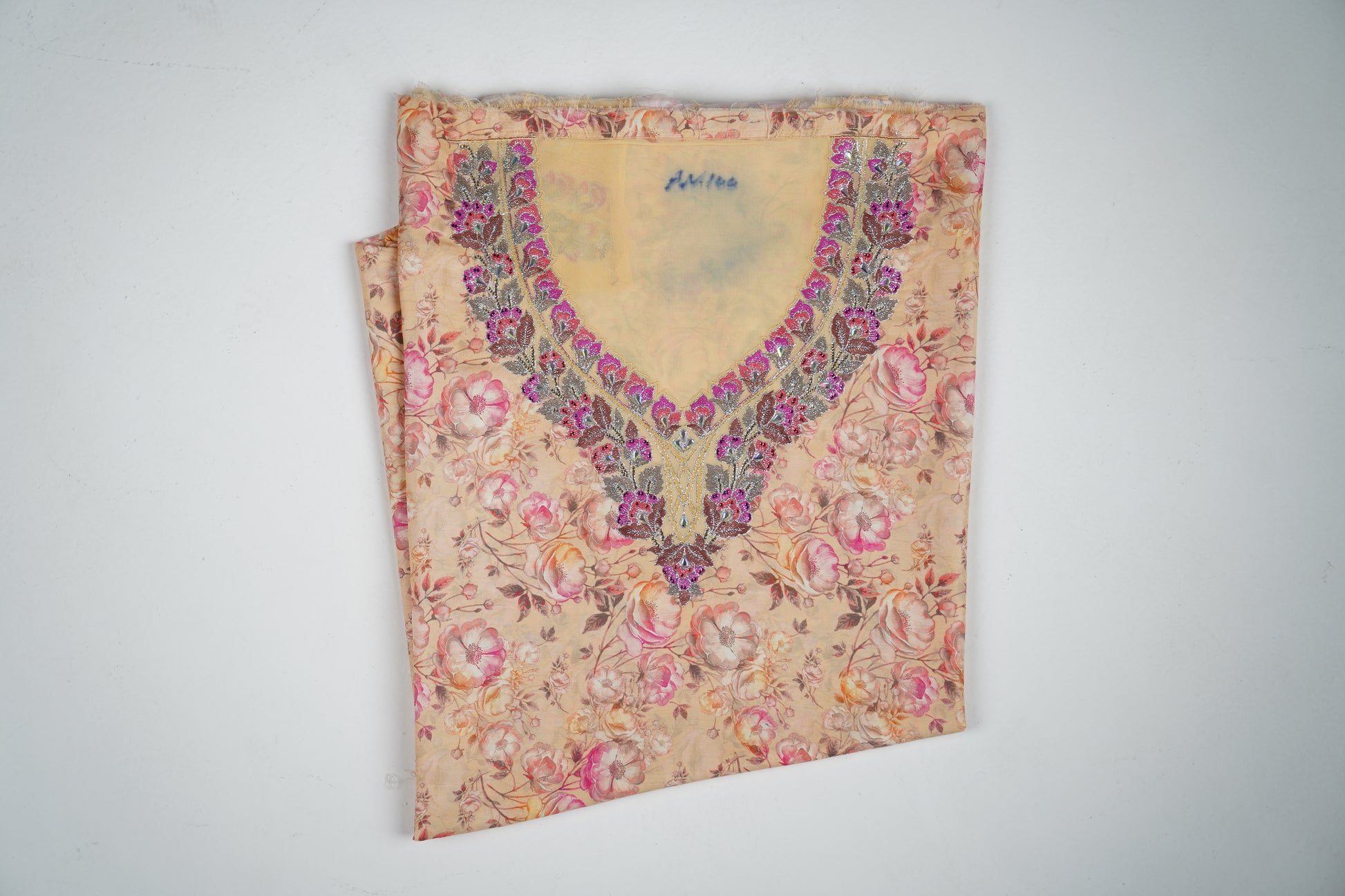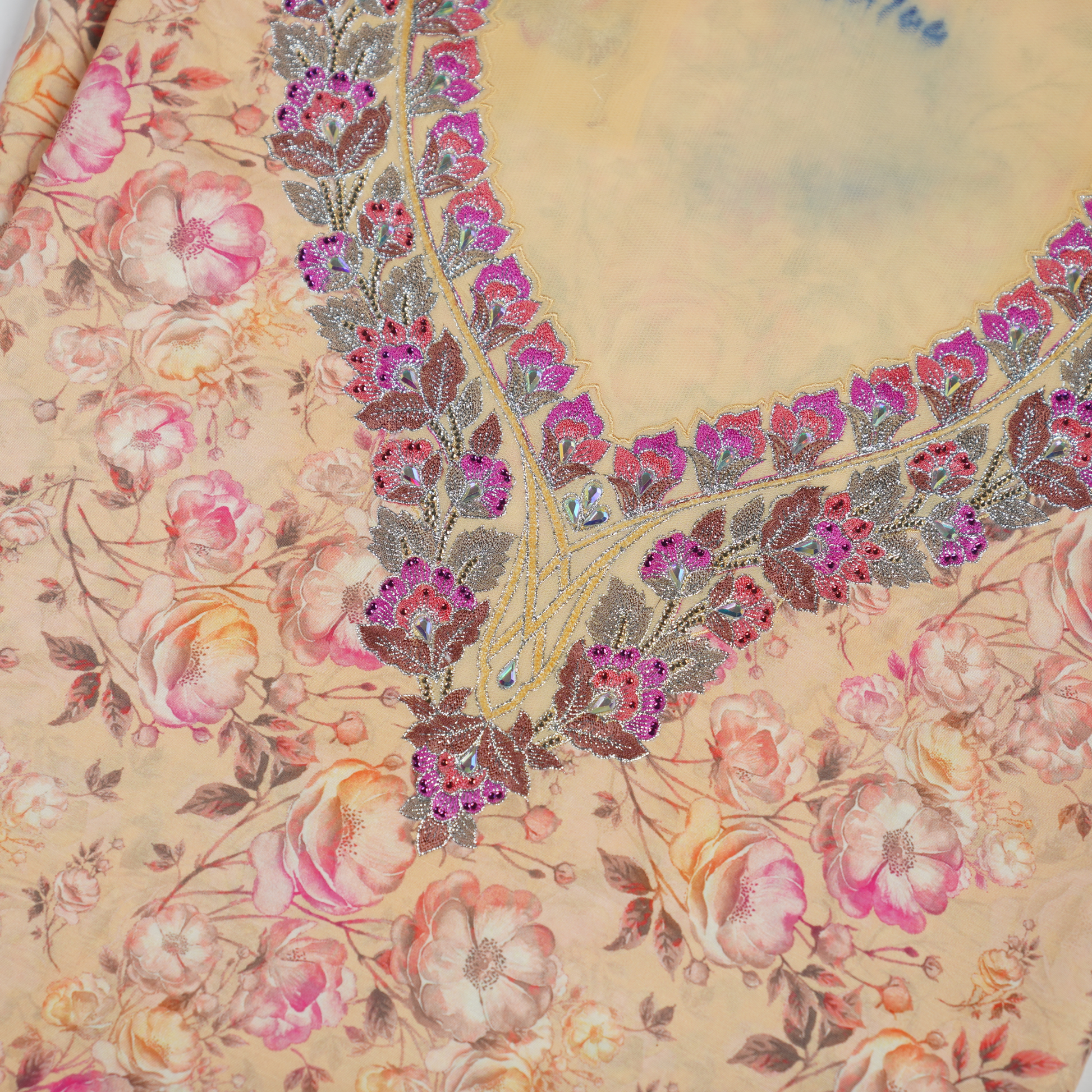 Elegant embroidery crafted in muted gold and silver threads, accented with sparkling blush and lilac tones that highlight the neckline with timeless sophistication.