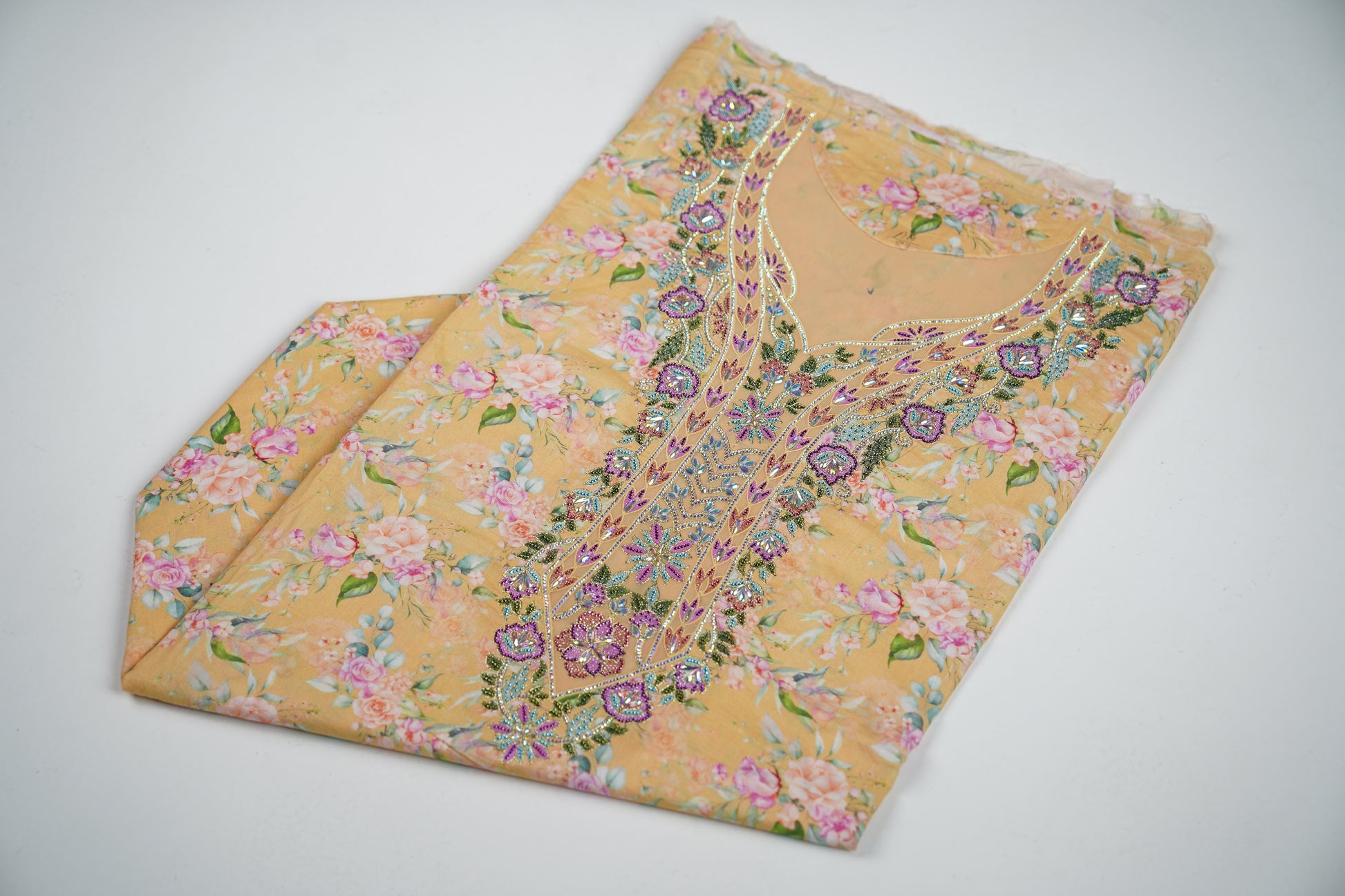 Crafted from light honey-golden cotton, printed with soft pink floral patterns and subtle green leaves, evoking warmth and freshness.