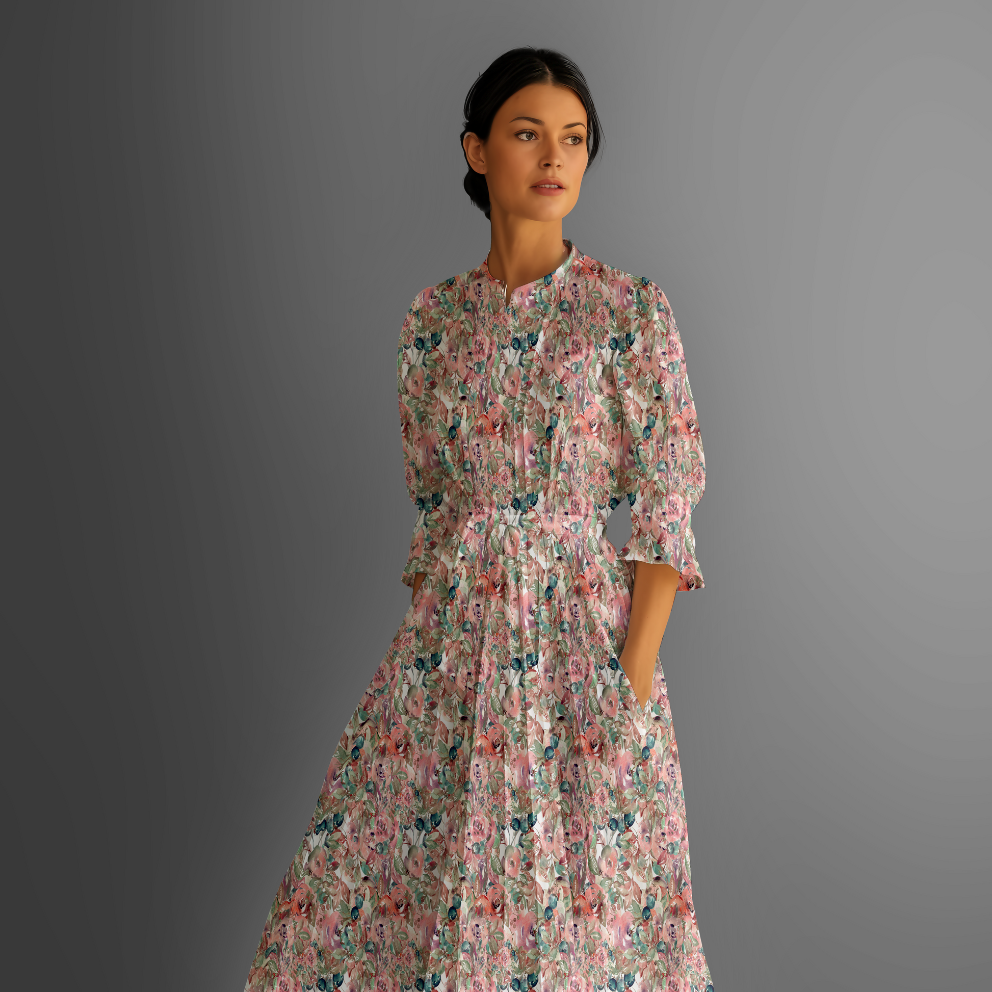 A dreamy symphony of blush, peach, and beige tones with soft watercolor florals delicately layered in harmony. Crafted from luxurious natural cotton, light and airy in texture, perfect for refined daywear that radiates calm femininity and effortless elegance.