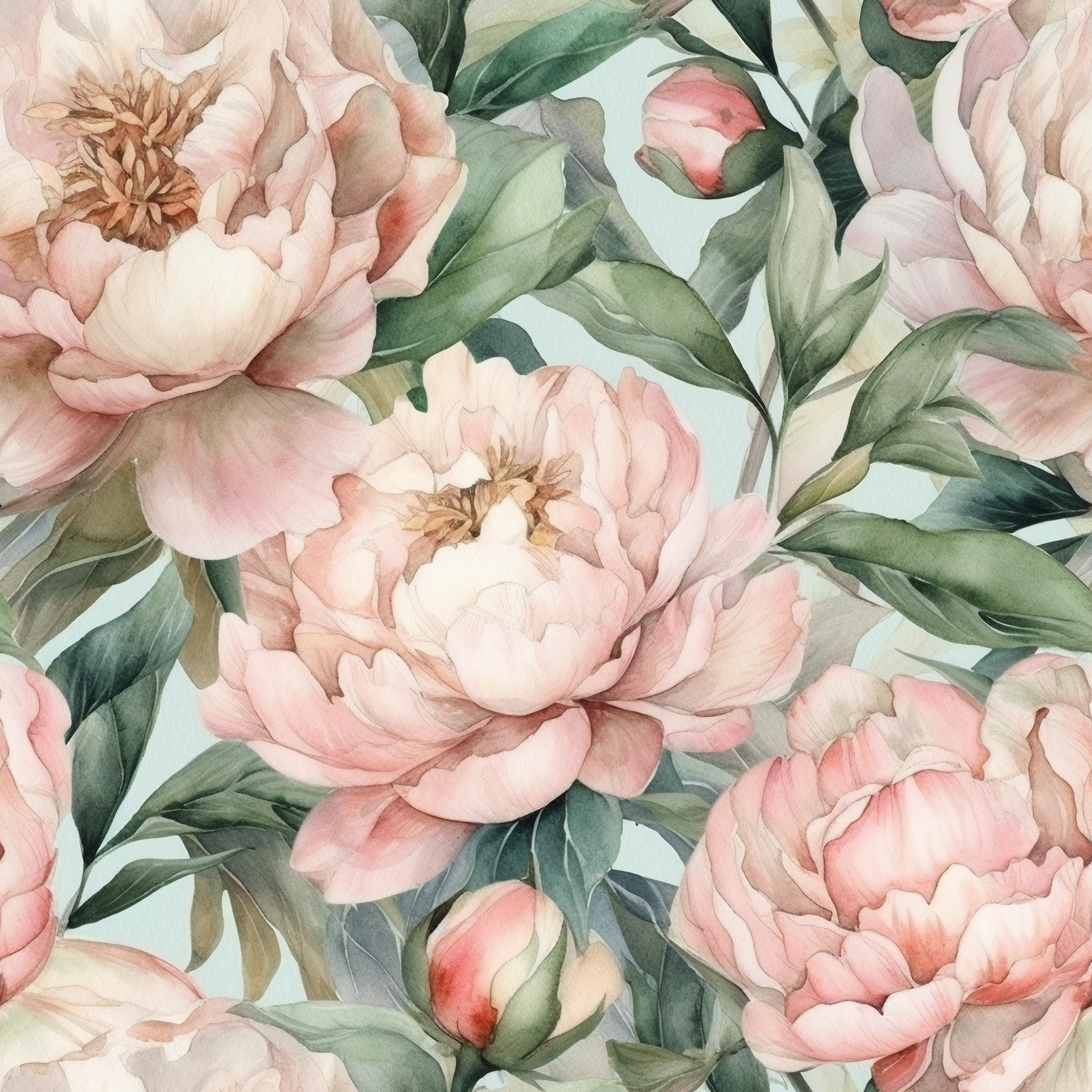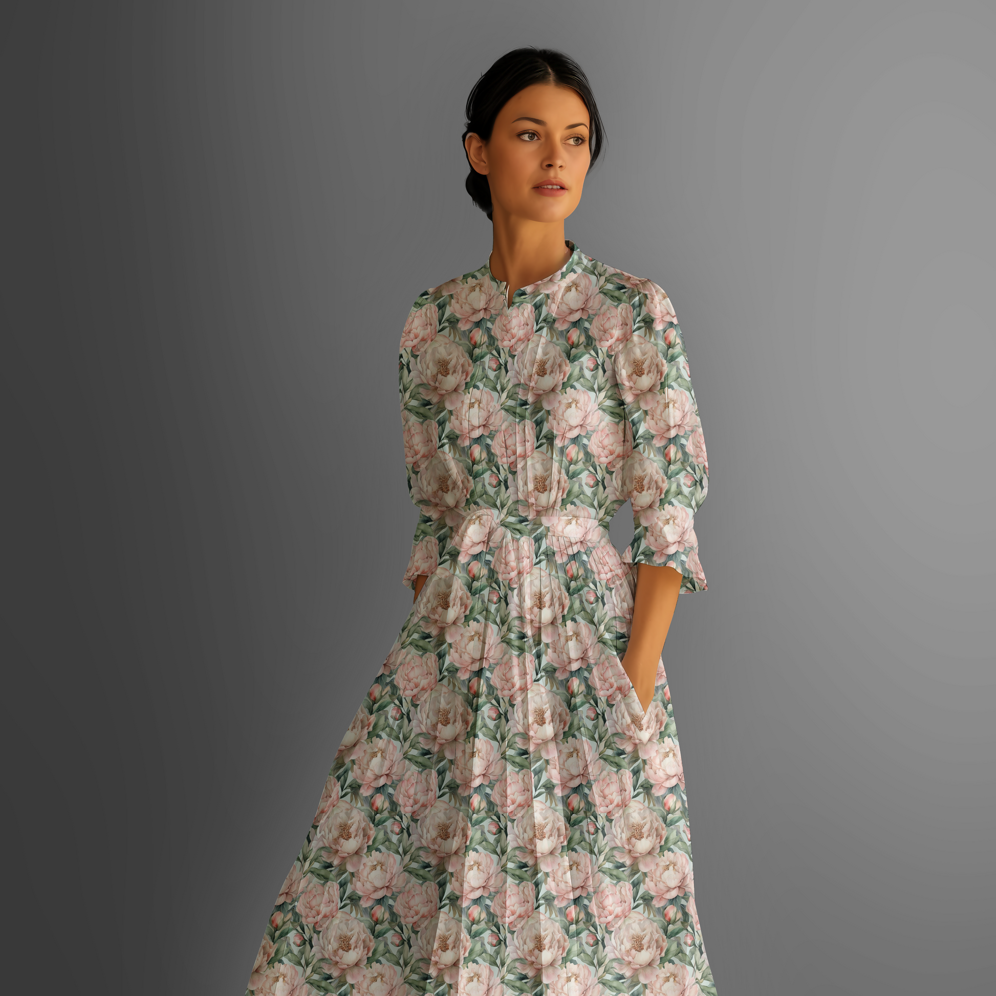 Soft blush and ivory flowers weave through gentle green foliage in this serene, feminine Yazhani print.