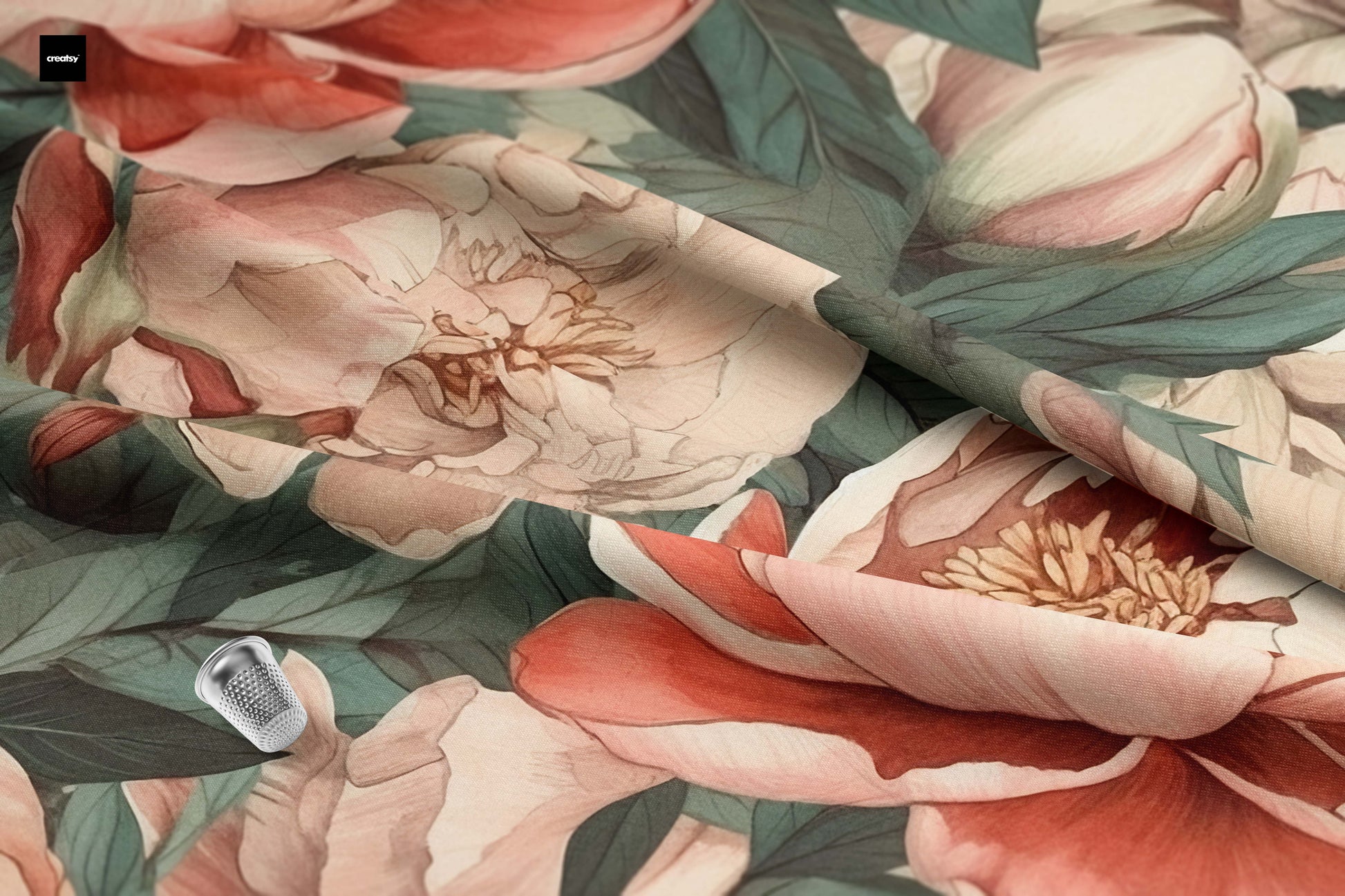 Soft blush and ivory flowers weave through gentle green foliage in this serene, feminine Yazhani print.