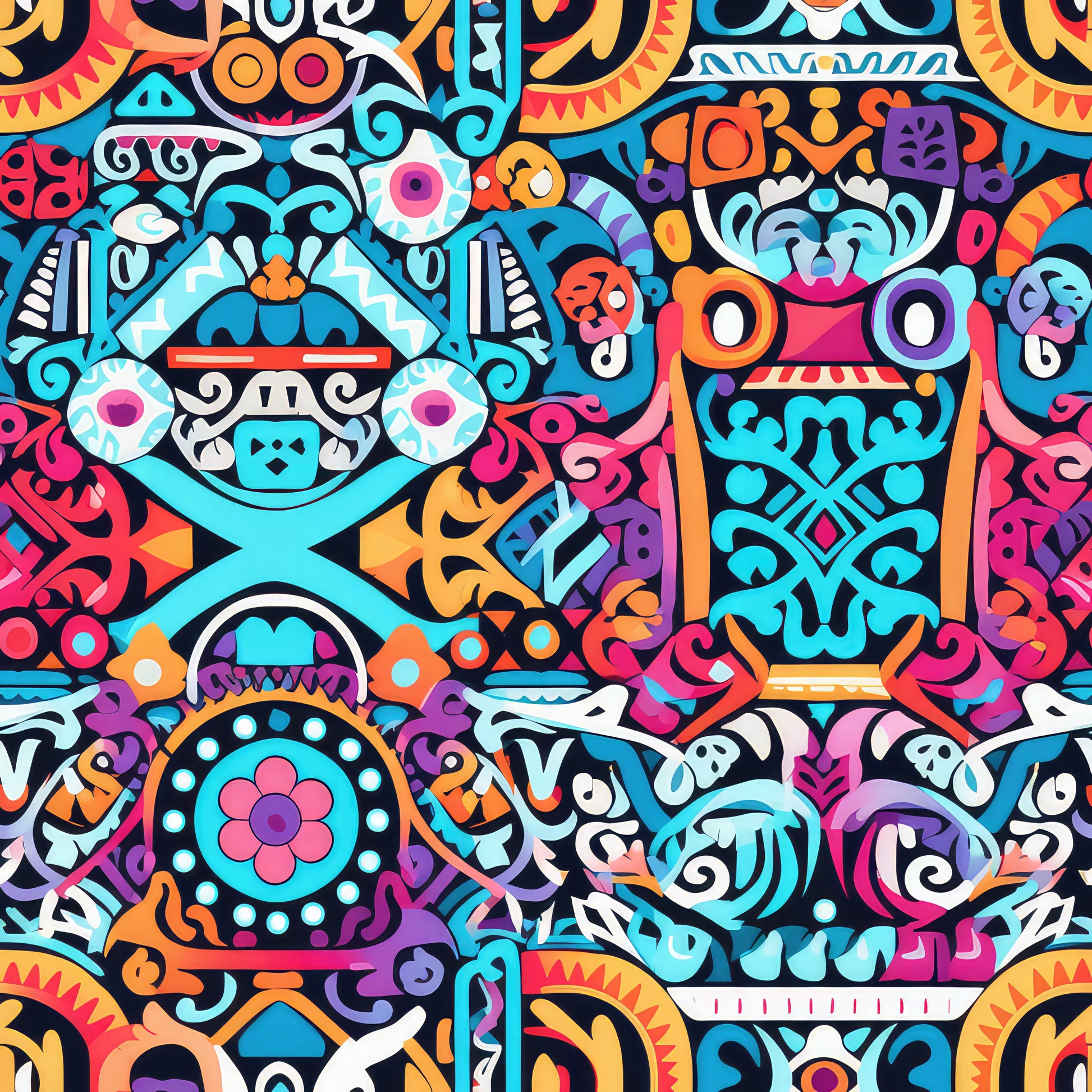 A bold, artistic composition bursting with vibrant fuchsia, turquoise, and amber patterns, reminiscent of abstract mosaics from the Arabian desert.