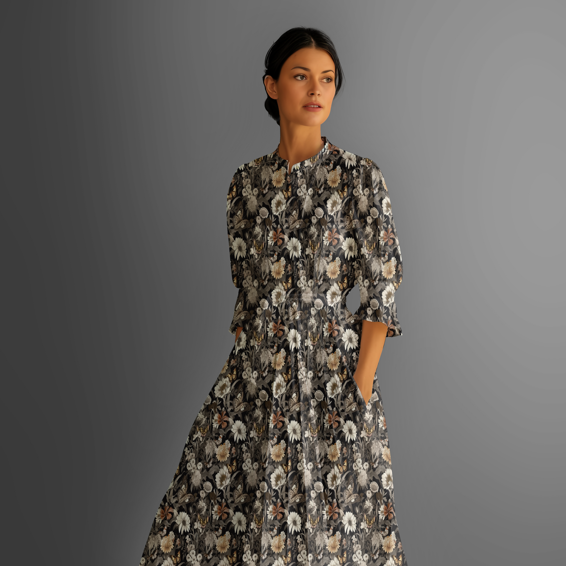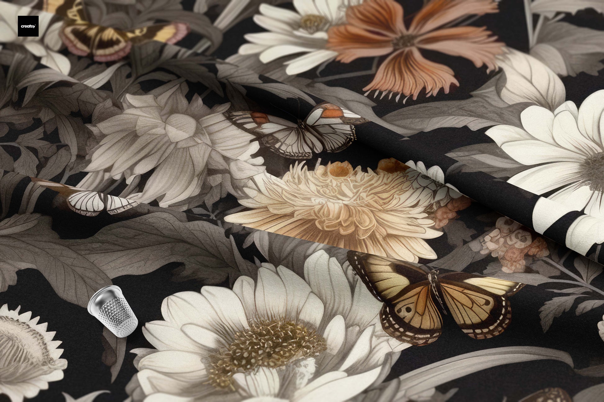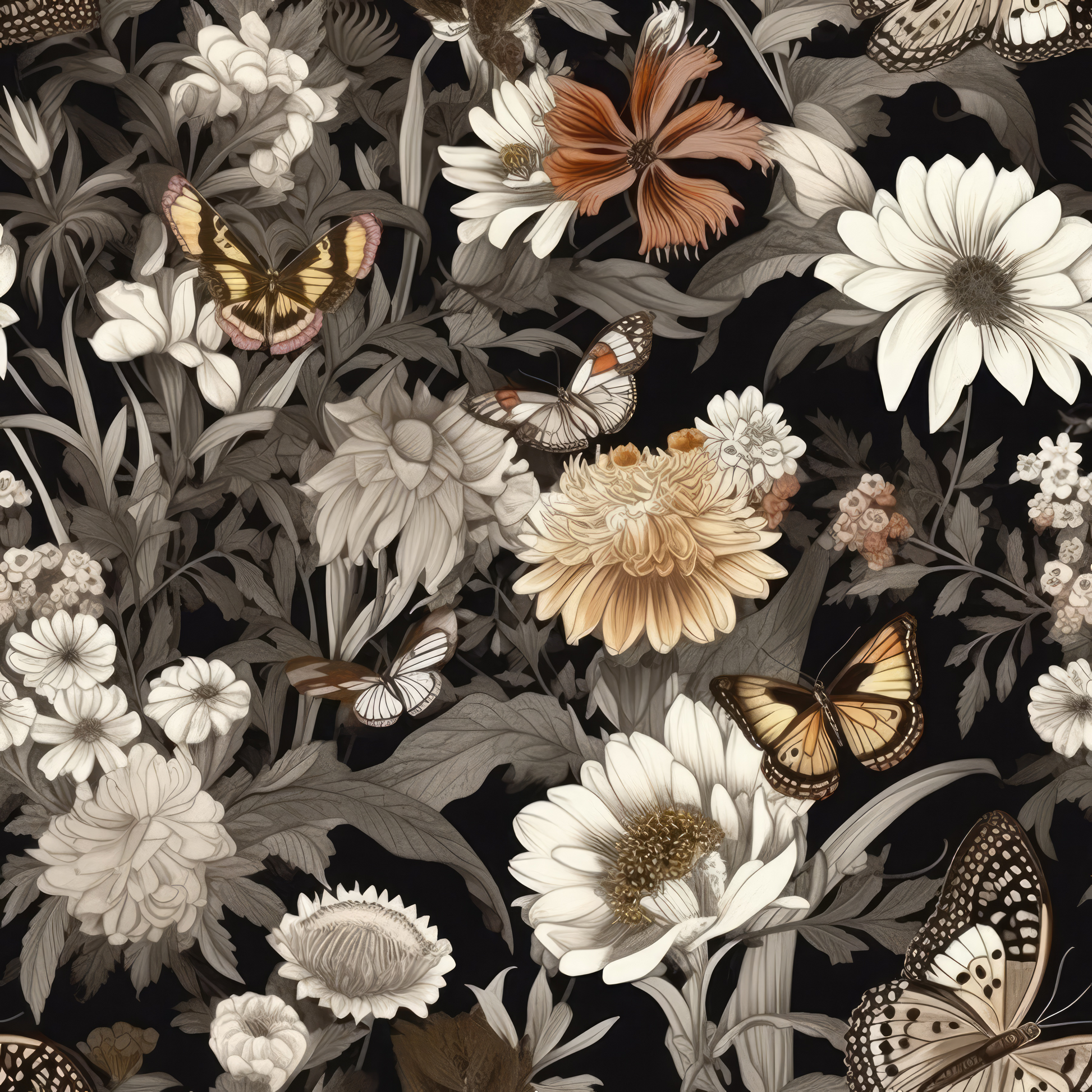 An elegant botanical design set against a deep black background, featuring ivory and amber florals intertwined with butterflies — a poetic balance of depth and refinement.
