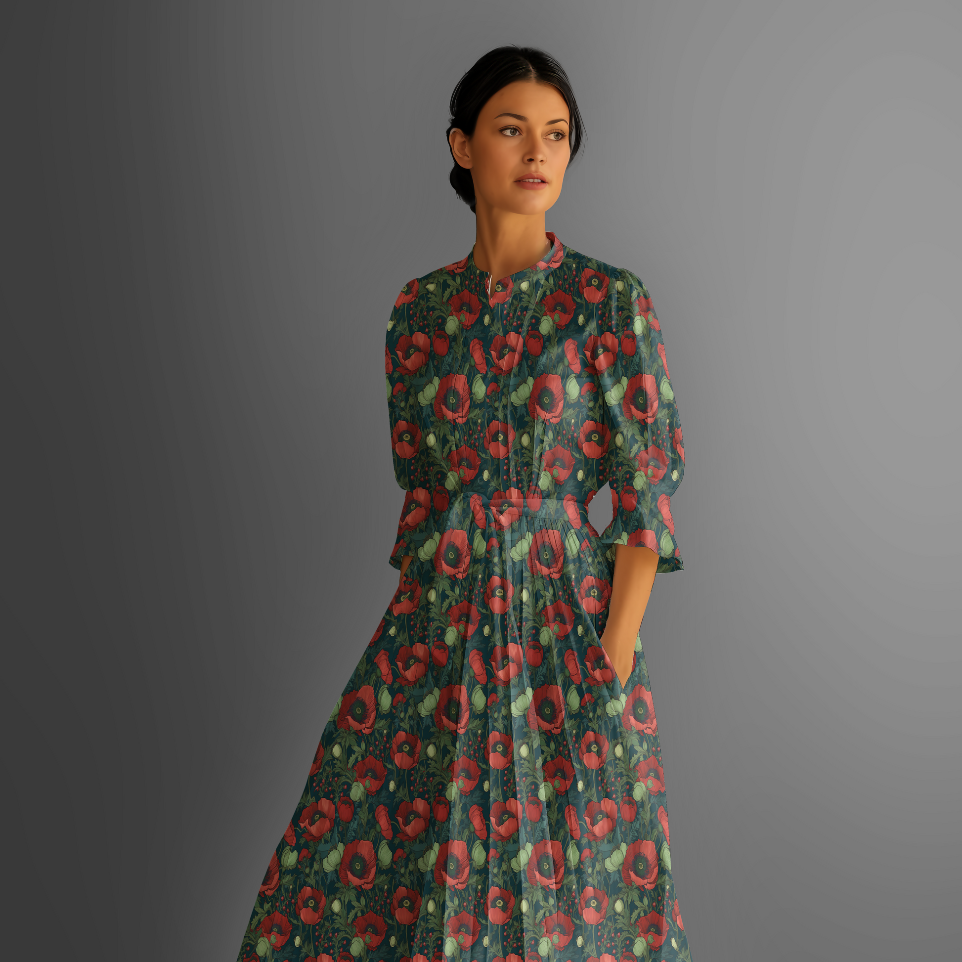 An exclusive Yazhani creation that celebrates bold femininity. The print unfolds with deep red poppies set against an elegant forest-green backdrop — a design that speaks of confidence and timeless allure.