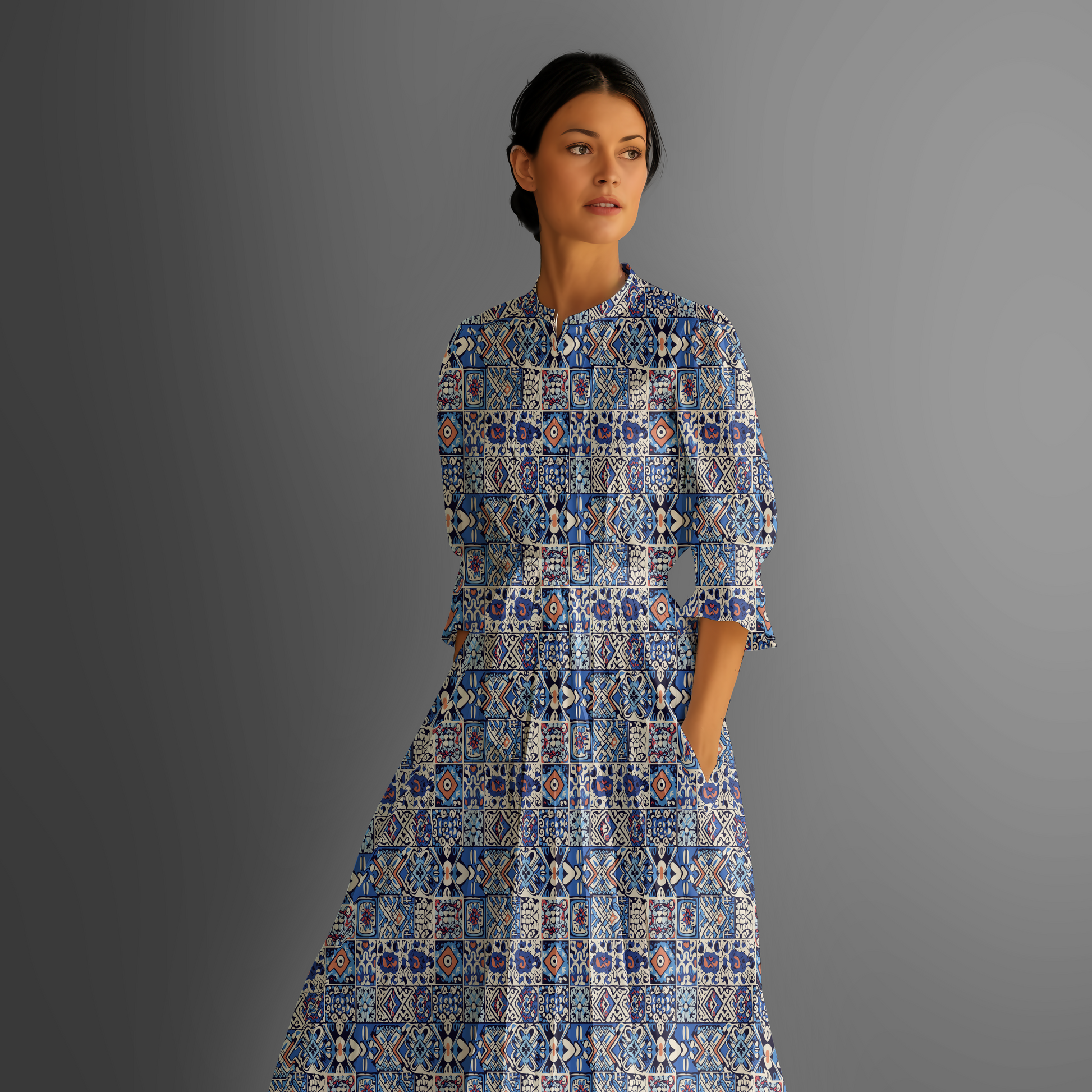 Inspired by royal mosaics, this pattern features intricate tile-like designs in sapphire blue and soft cream, symbolizing balance and serenity.
